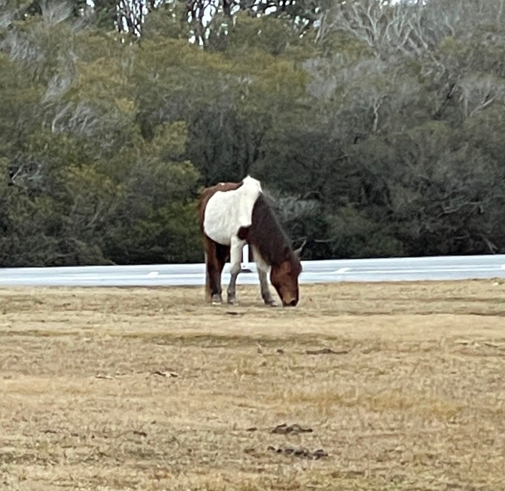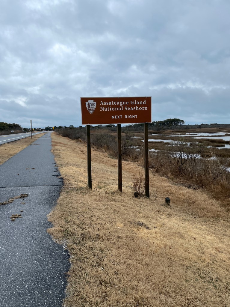 I saw some awesome wildlife too, including some ring-necked ducks, four surfers in wetsuits out in the huge but freezing cold waves (crazy humans are wildlife too, right?!?), a family of seals (I watched their bobbing heads swim down the bay for quite awhile!), and my very favorite (and something I had only read about, as there had never been one close enough to view on my college trips to Chincoteague), a wild Assateague pony! The pony was as close as he could safely be, grazing in the grass next to the bike trail as I walked past.