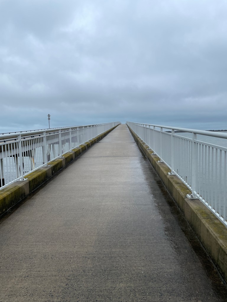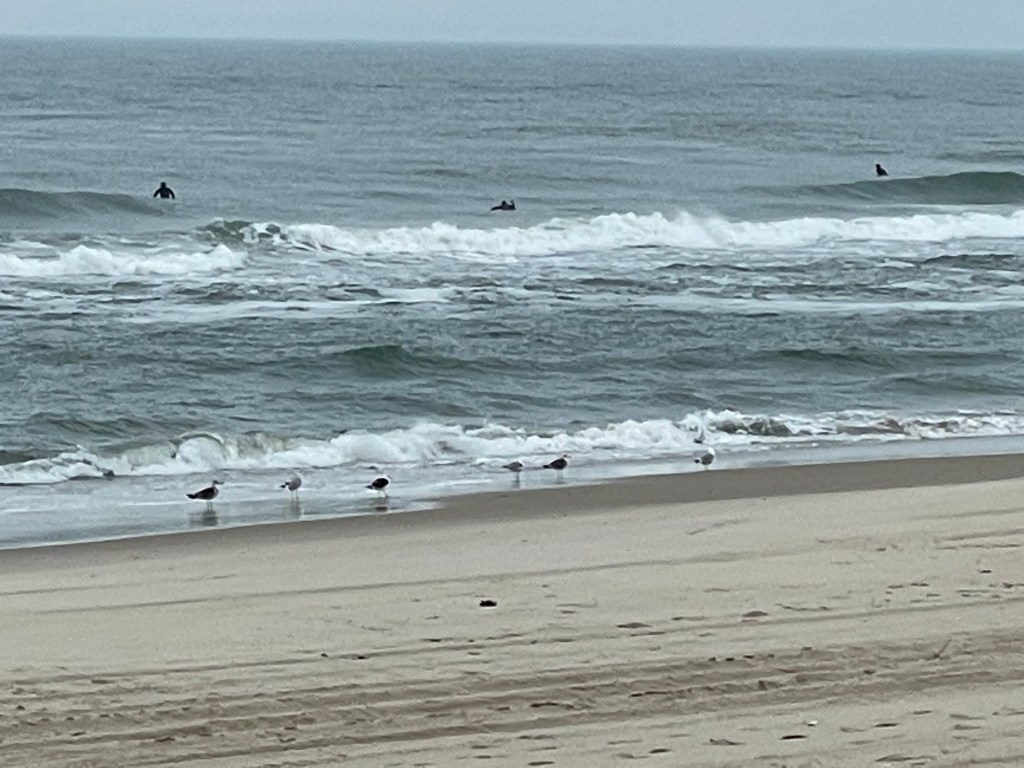 Assateague Island is not very far from Ocean City. In fact, I think it took me 15 minutes or less to get there from my OC boardwalk hotel. Like OC, Assateague was relatively deserted. There were a few hikers’ cars in the visitor center’s parking lot, and I joined them, put on my rain gear, and set off to walk across the Verrazano bridge over the Sinepuxent Bay and to the wild Atlantic shores of the island. The weather was initially okay – cloudy but warm enough. But it had been raining off and on for days and there were some very ominous dark clouds above. I ended up being very glad I had thrown on my rain gear just in case.