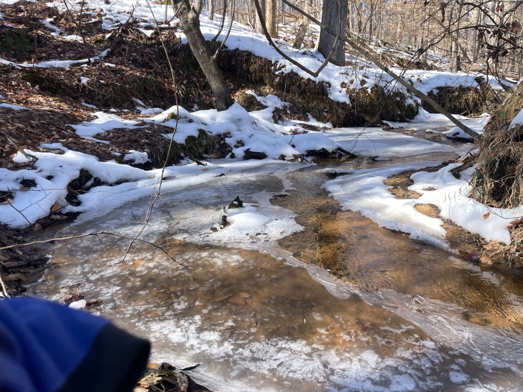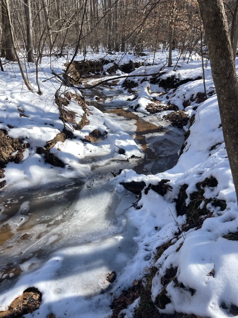 In the spirit of microadventuring, I stayed very close to home. In fact, I walked down a trail into the woods immediately behind my house. (I am very fortunate to live in a house with a back yard that adjoins deeded county conservation land, so the woods are never far away.) I carried a small camp chair and a hot cup of coffee. And I walked through the woods to a small creek that runs behind our house. (My family has done a great deal of playing in and adventuring along this tiny stream throughout the years we’ve lived here. According to Apple Maps, it is called Fowlers Mill Branch, and it runs downstream to the west from some distance east of us, all the way across Southern Maryland Blvd (Rte. 4) and into Hall Creek – a much larger and better known creek that itself runs into the Patuxent River soon thereafter.) The stream was partially frozen over, but a decent contingent of it had melted, and as running water is wont to do, was desperately seeking to break free of its icy cage. I plopped down my chair near the creek bed and sat to watch for a time.