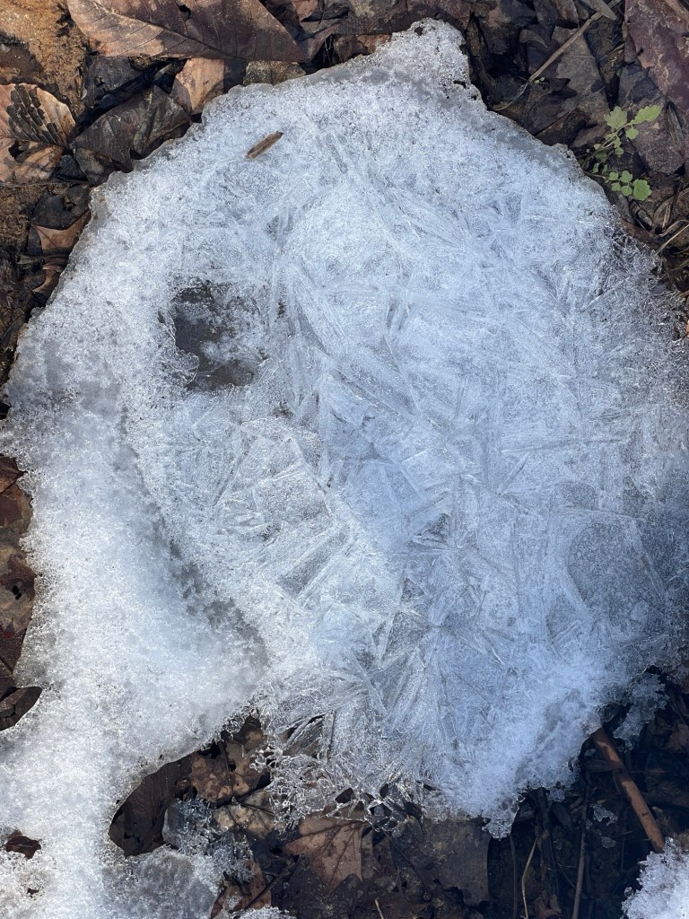 My attention now focused fully on the creek right in front of my feet, and I became almost immediately transfixed by the water itself. I watched the running melted water, in trapped rivulets and bubbles caught underneath the icy plates. Each bubble fought for its own right to move, to keep moving, to return to and rejoin its intended place – its home. As far as I could see it, that home was first in this little stream. But then (as I might have envisioned on a map), I imagined the bubbles pushing their way to Hall Creek, and then all the way down to the Patuxent River. I was so impressed by these trapped bubbles that refused to be contained by their icy cages and fought, fought, fought to rejoin their mother of moving water that I took a video of it.